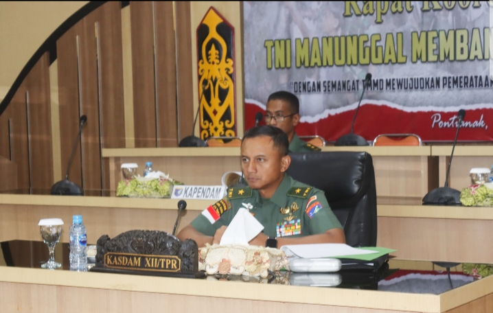 Kasdam XII/Tpr didampingi Aster Kasdam XII/Tpr. Rapat dipimpin Waaster Kasad Bidang Tahwil Komsos dan Bhakti TNI, Brigjen TNI Taufiq Shobri. Adapun tema yang diusung kali ini “Dengan Semangat TMMD Mewujudkan Pemerataan Pembangunan dan Ketahanan Nasional di Wilayah”.