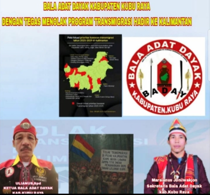 Kami dari Aktivis Bala Adat Dayak Kabupaten Kubu Raya dengan tegas menolak program transmigrasi.ungkap Ulianis.,S.pd, Itu bukan solusi bagi masyarakat adat Kalimantan Barat. Justru kami merasa kebijakan ini akan memicu konflik sosial, mempersempit ruang hidup kami, dan mencederai prinsip keadilan sosial yang dijanjikan negara,” ujar perwakilan Bala Adat dalam konferensi pers yang digelar di Kubu Raya, Sabtu (13/7).