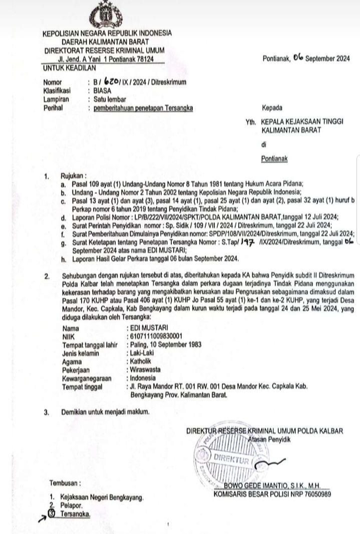 Namun, dalam perkara pidana terpisah, Edi Mustari yang diduga telah merusak sekitar 850 batang pohon sawit dan ratusan pohon pinang milik Lie Cin Fa di Desa Mandor, Kecamatan Capkala, telah ditetapkan sebagai tersangka oleh penyidik Polda Kalbar. Hal itu tertuang dalam Surat Pemberitahuan Penetapan Tersangka Nomor: B/620/IX/2024/Ditreskrimum Polda Kalbar, yang dikeluarkan sejak September 2024.