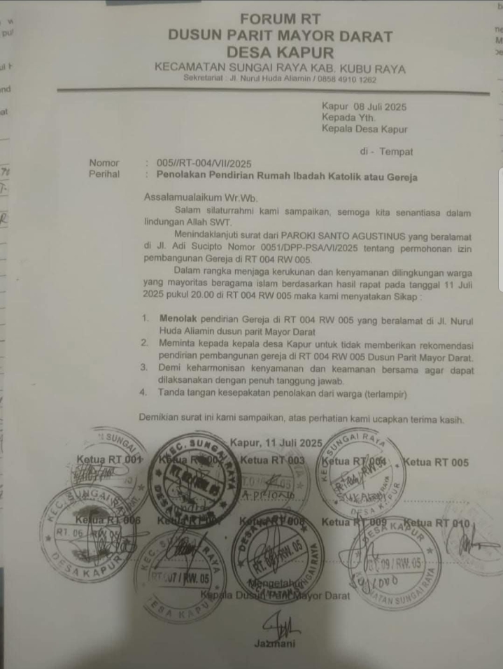 Crimehanternews.com -Pemerintah Kabupaten Kubu Raya mengambil langkah cepat menyikapi surat yang mengatasnamakan Forum RT Dusun Parit Mayor Darat, Desa Kapur, Kecamatan Sungai Raya, tertanggal 8 Juli 2025, yang berisi dugaan penolakan terhadap pendirian rumah ibadah di wilayah tersebut.