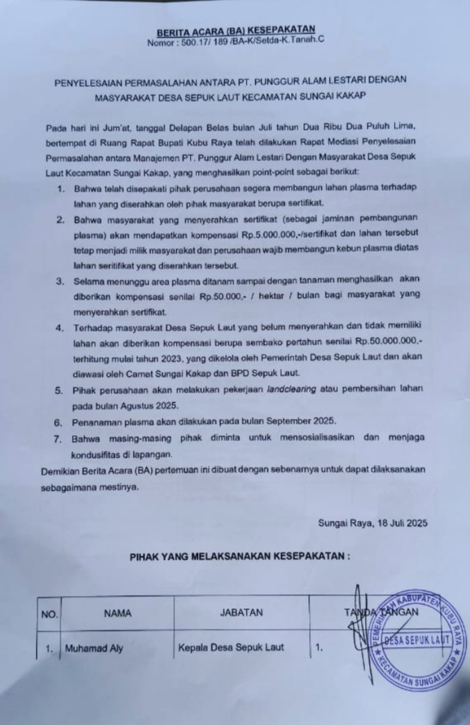 Selanjutnya perusahaan akan membangun plasma dan akan mulai lin kliring pada bulan Agustus 2025 dan akan melakukan tanam perdana di bulan September 2025, itulah yang kita tuangkan dalam kesepakatan ini, kita berharap semoga masyarakat bisa menerima karna ini kita mencari win- win solusine, begitu juga yang di sampaikan oleh pemerintah daerah, maka perusahaan siap mendukung pemerintah, bagaimna perekonomian masyarakat di desa sepok laut bisa berjalan dengan baik dan paling terpenting keamanan di Kabupaten Kubu Raya ini bisa kondusif, dalam hal ini perusahaan siap dan sangat siap untuk membangun perekonomian masyarakat bisa naik dan lebih baik, mediasi hari ini sudah final dan clear atas kesepakan bersama – sama,” tutup Togar.