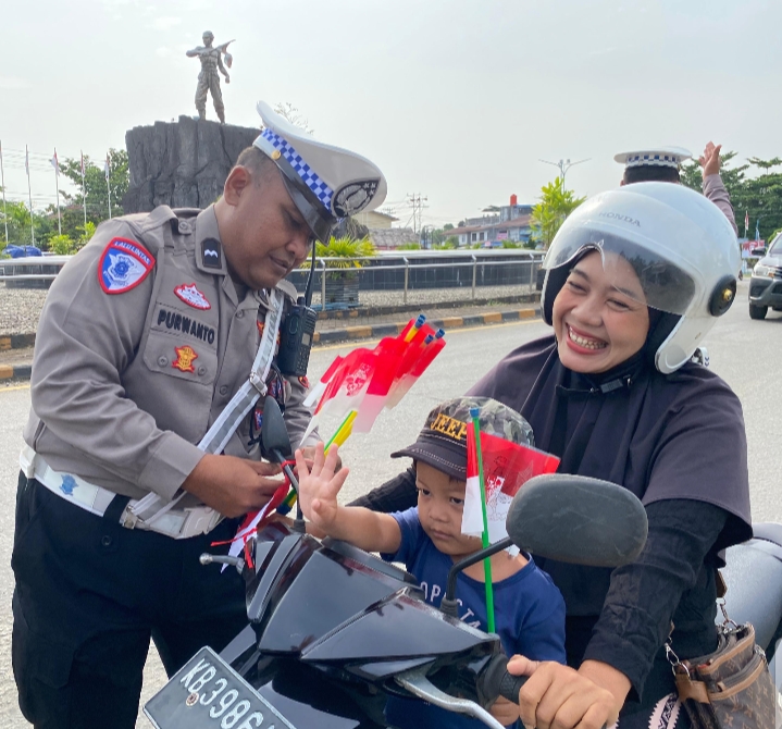 Crimehanternews.com – Polres Melawi Polda Kalbar, Guna memperingat Hari Kemerdekaan Republik Indonesia ke -80 tahun 2025 serta meningkatkan dan menanamkan jiwa patriotisme, nasionalisme cinta tanah air bangsa dan negara Indonesia, Polres Melawi membagikan bendera kepada masyarakat pengguna jalan di Tugu Juang II Nanga Pinoh, pelaksanaannya di pimpin langsung Kasat Lantas Polres Melawi Iptu J.E.Kusuma, S.A.P., M.H, Rabu (6/8).