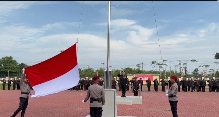 Wakapolres Kubu Raya, Kompol Hilman Malaini, memimpin. Dengan khidmat, pasukan upacara mengibarkan Sang Saka Merah Putih, diiringi lagu kebangsaan Indonesia Raya yang menggema di lapangan apel Mapolres Kubu Raya.