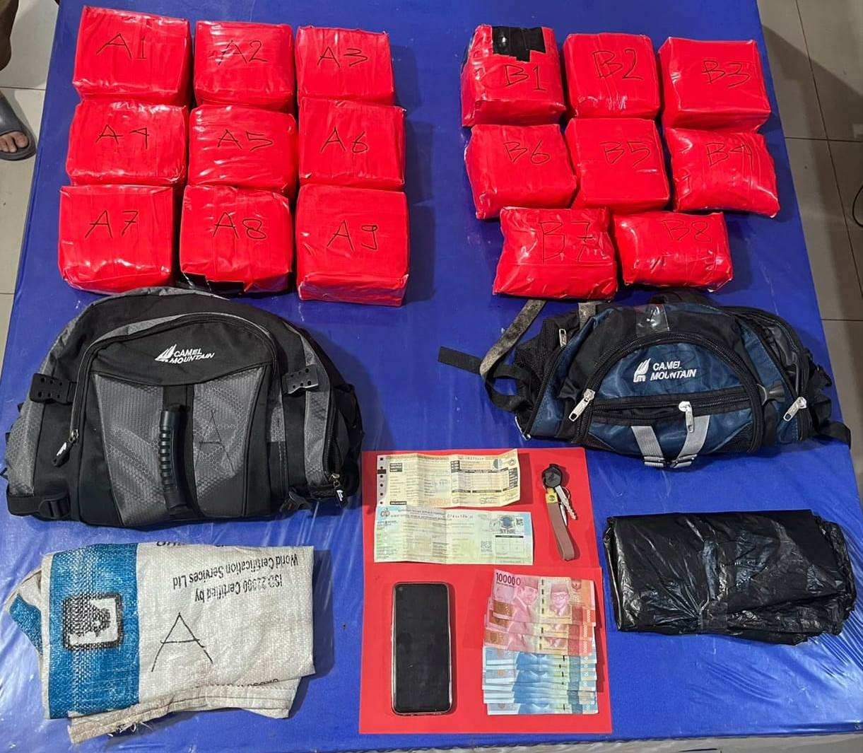 Dari hasil penggeledahan, polisi menemukan 17 paket sabu yang dibungkus rapi menggunakan lakban merah di dalam dua tas ransel merek Camel Mountain. Sembilan paket ditemukan di tas abu-abu dan delapan paket lainnya di tas biru. Barang bukti lain yang turut diamankan antara lain satu unit sepeda motor, satu telepon genggam, STNK, serta satu karung bertuliskan “Penggemuk Ayam Daging 202”.