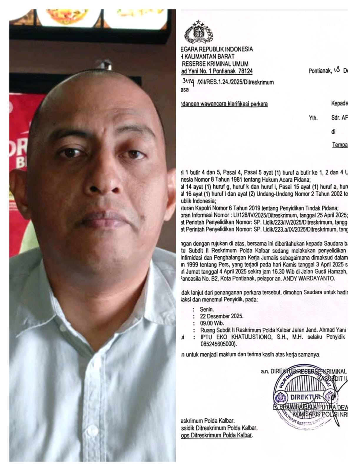 Apriansyah menyatakan keberatan keras dan merasa dirugikan secara moral setelah menerima undangan wawancara klarifikasi dari Polda Kalbar atas dugaan tindak pidana sebagaimana diatur dalam Undang-Undang Nomor 40 Tahun 1999 tentang Pers.
