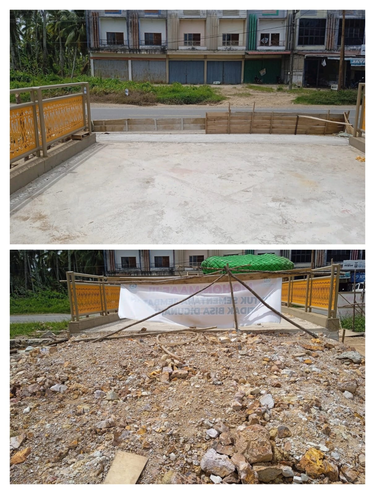 diduga jembatan terbengkalai melihat kondisi jembatan yang belum selesai dan terlambat diselesaikan oleh kontraktor