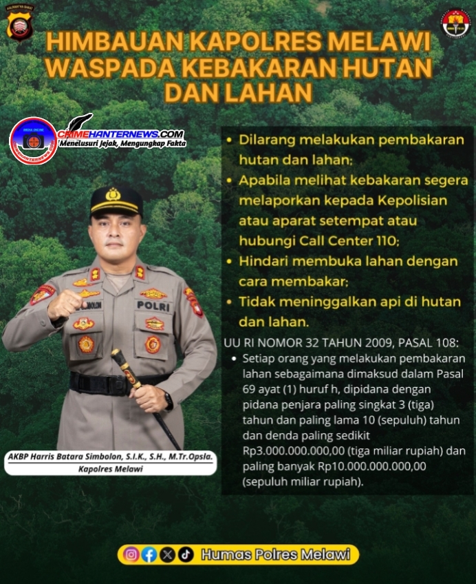 Humas Res Mlw (Arb).Crimehanternews.com – Polres Melawi Polda Kalbar – Kapolres Melawi, AKBP Harris Batara Simbolon, S.I.K., S.H., M.Tr.Opsla, mengimbau seluruh masyarakat Kabupaten Melawi untuk meningkatkan kewaspadaan terhadap potensi kebakaran hutan dan lahan (Karhutla), terutama memasuki musim kemarau.