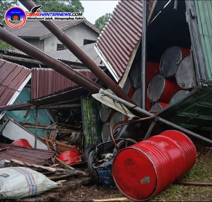 Sebuah truk tanpa plat nomor yang diduga mengangkut BBM jenis solar subsidi dalam puluhan drum besi menabrak tiang listrik serta dua warung milik warga di Jalan Lintas Selatan, Dusun Bangan Permai, Desa Tanjung Intan, Kecamatan Mentebah, Kabupaten Kapuas Hulu, Senin (16/3/2026).